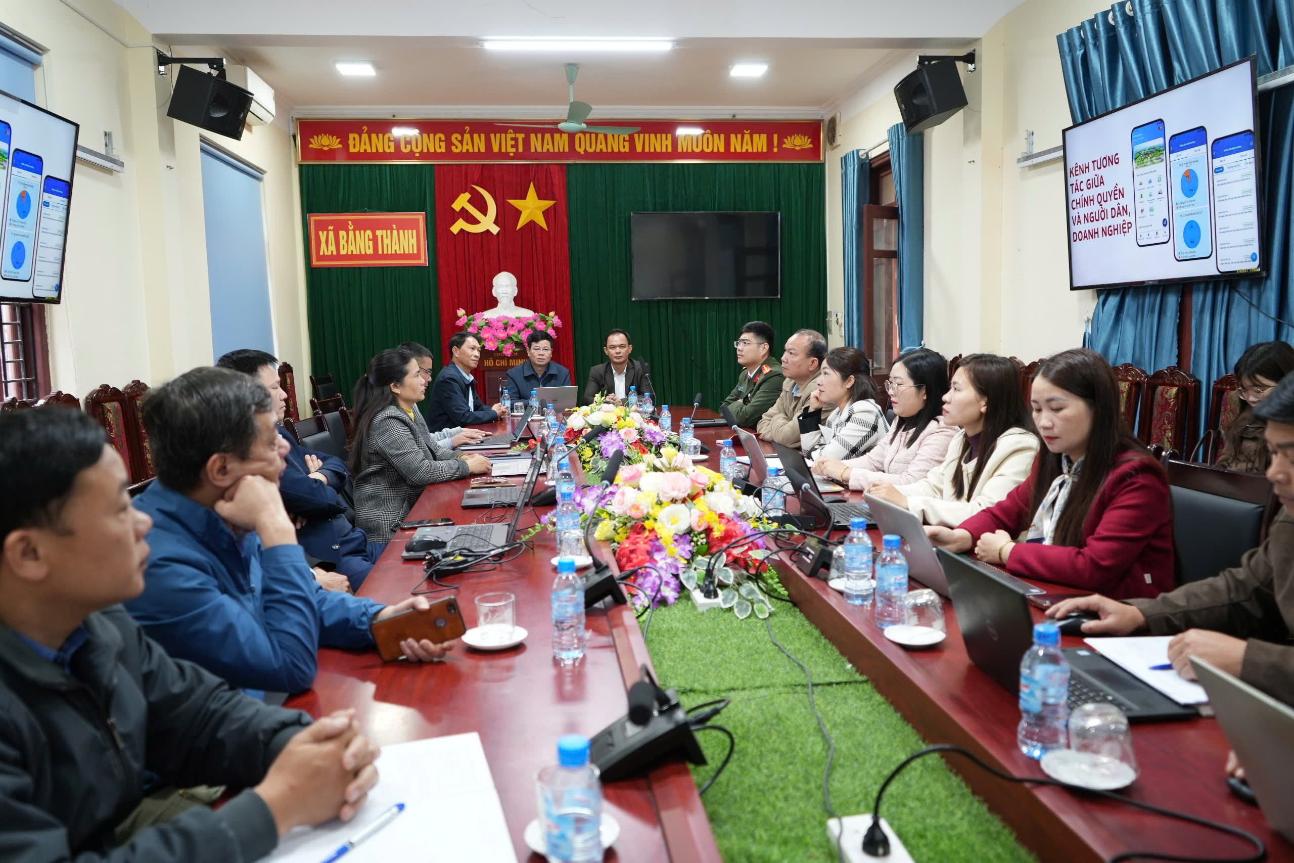 Sáng 13/3, UBND tỉnh Thái Nguyên tổ chức Hội nghị trực tuyến Lễ khai trương Trung tâm Dữ liệu tỉnh Thái Nguyên, kết nối từ điểm cầu chính tại Hội trường tầng 2, trụ sở Đoàn ĐBQH, HĐND và UBND tỉnh tới các điểm cầu cấp xã trong toàn tỉnh. Dự hội nghị, tại điểm cầu xã Bằng Thành có các đồng chí: Đào Duy Hưng, Bí thư Đảng ủy, Chủ tịch HĐND xã; Cà Văn Thưởng, Phó Bí thư Đảng ủy, Chủ tịch UBND xã cùng lãnh đạo các ban, ngành, đoàn thể, đơn vị trên địa bàn.